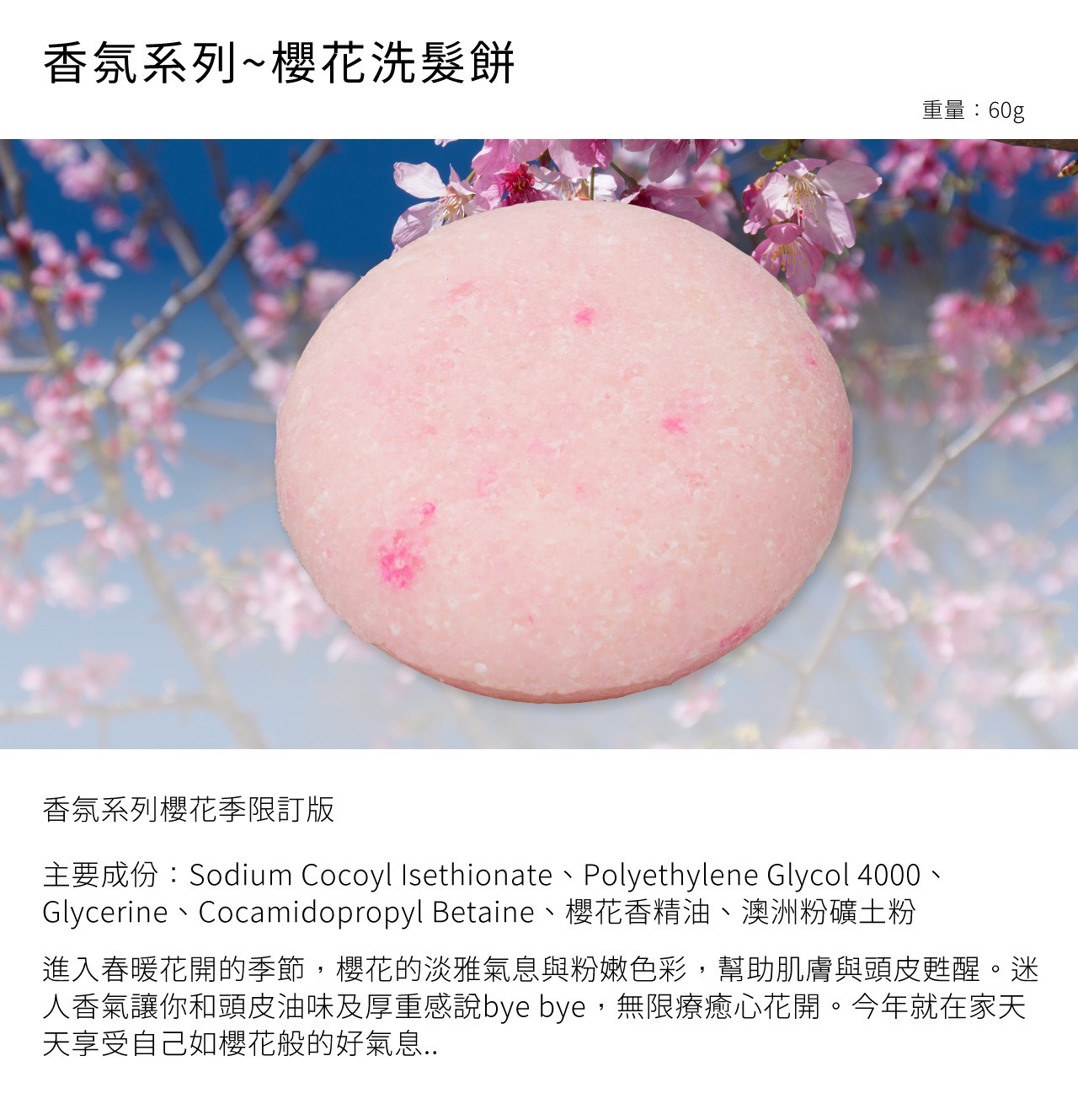 主要成份:Sodium Cocoyl Isethionate、Polyethylene Glycol 4000、Glycerine、Cocamidopropyl Betaine、櫻花香精油、澳洲粉礦土粉