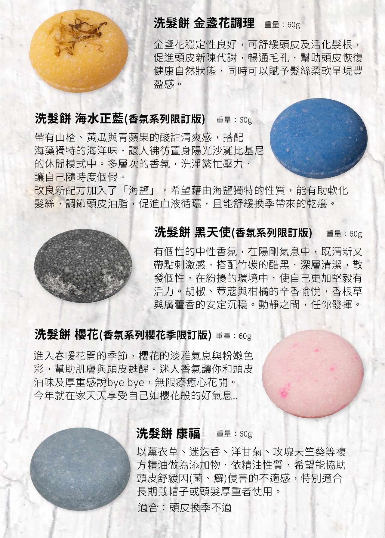 主要成份:Sodium Cocoyl Isethionate、Polyethylene Glycol 4000、Glycerine、Cocamidopropyl Betaine、Indigofera Tinctoria Leaf Powder、水、精油(薰衣草、迷迭香、洋甘菊、玫瑰天竺葵)