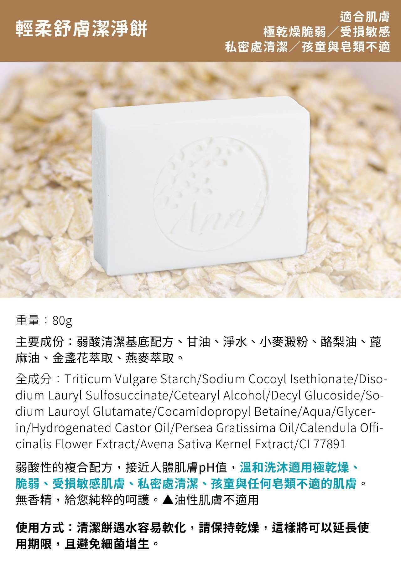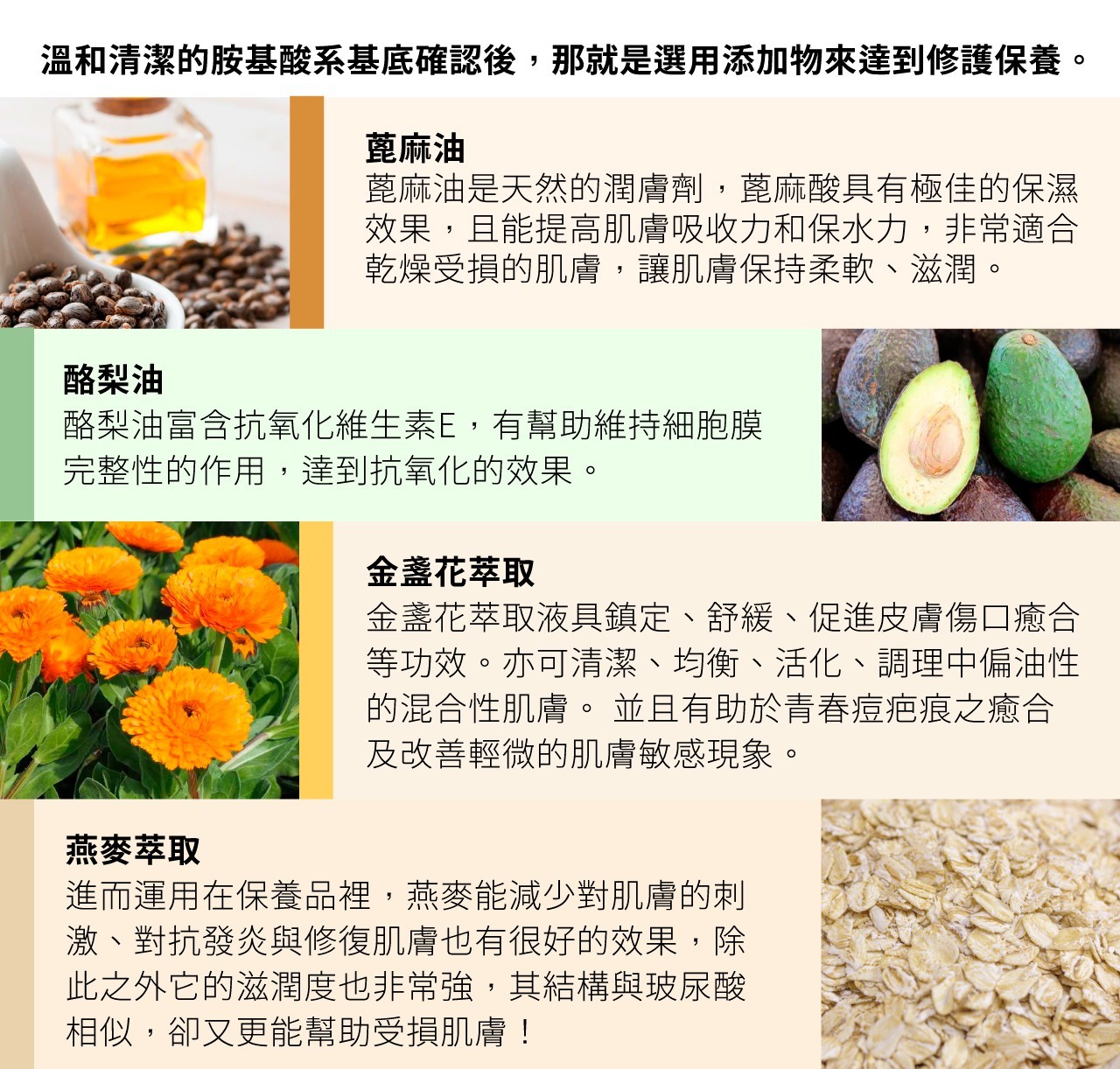 主要成份:弱酸清潔基底配方、甘油、淨水、小麥澱粉、酪梨油、蓖麻油、金盞花萃取、燕麥萃取。