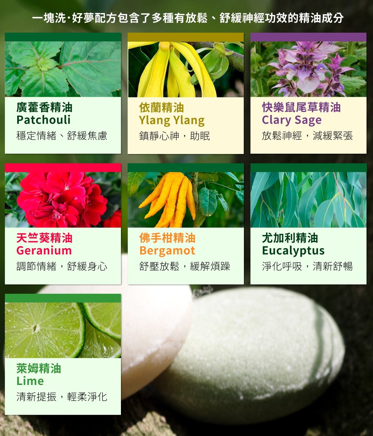 主要成份:廣藿香精油(Patchouli)、依蘭精油(Ylang Ylang)、快樂鼠尾草精油(Clary Sage)、天竺葵精油(Geranium)、佛手柑精油(Bergamot)、尤加利精油(Eucalyptus)、萊姆精油(Lime)、植物性清潔基底、天然保濕成分。